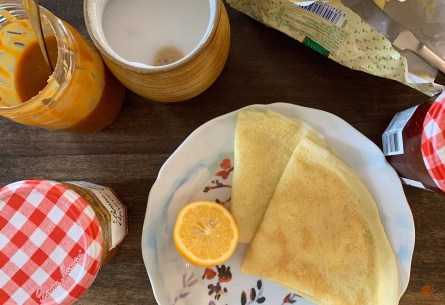 Meanwhile, I have a new crepe recipe for you. Compared to the previous version in my blog, this one is thinner, lighter, and more pliable. So it’s suitable for your dessert party where you want a crepe soft enough to wrap around filling of your choice (fruits, jam, Nutella – yes!), and light enough not to fill you with more carbs.