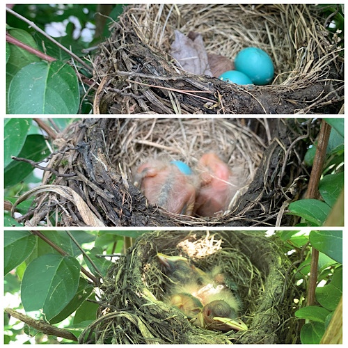 We are so lucky! Not only did a female robin decide to make a nest in a small bush right next to our front door but also laid three little blue eggs. The kids are beyond thrilled. They can observe different stages of robin growth: from the magical arrival of each egg to hatched bare-skinned chicks. After just a couple of days, these cuties are now covered with lots of feathers. We cannot wait to see them fly!