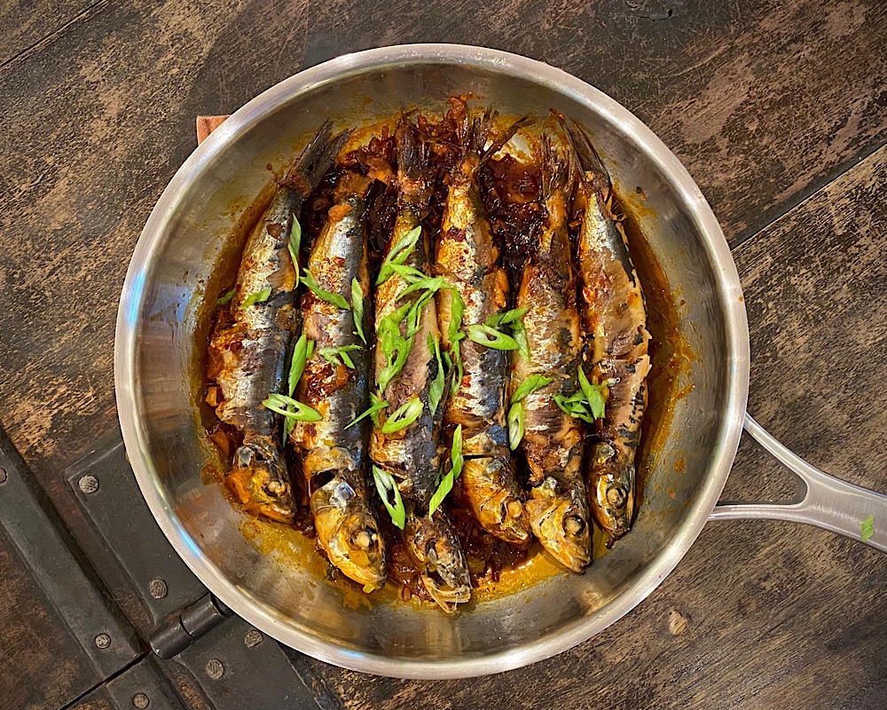 - Add sardines in one layer and fry both sides over medium heat.