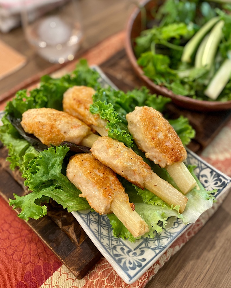 - Serve the fried shrimp paste on sugarcanes with cooked vermicelli, lettuce, cucumbers, and herbs.