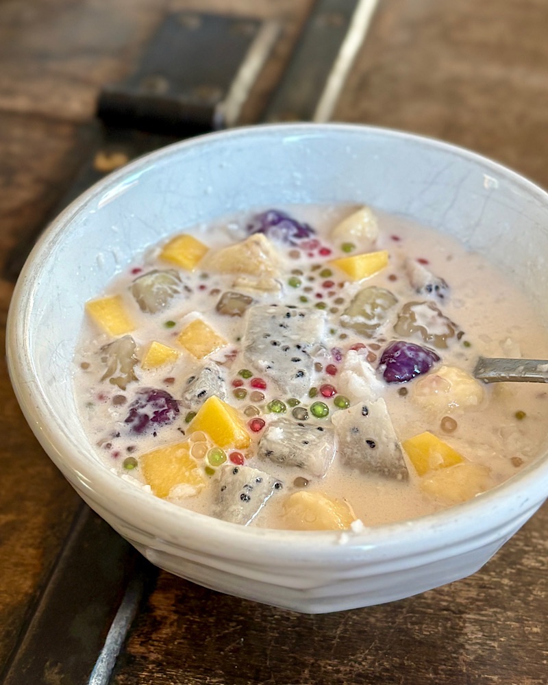 - In a large serving bowl, add drained sweet potato dumplings + drained tapioca pearls + cubed fresh fruits.