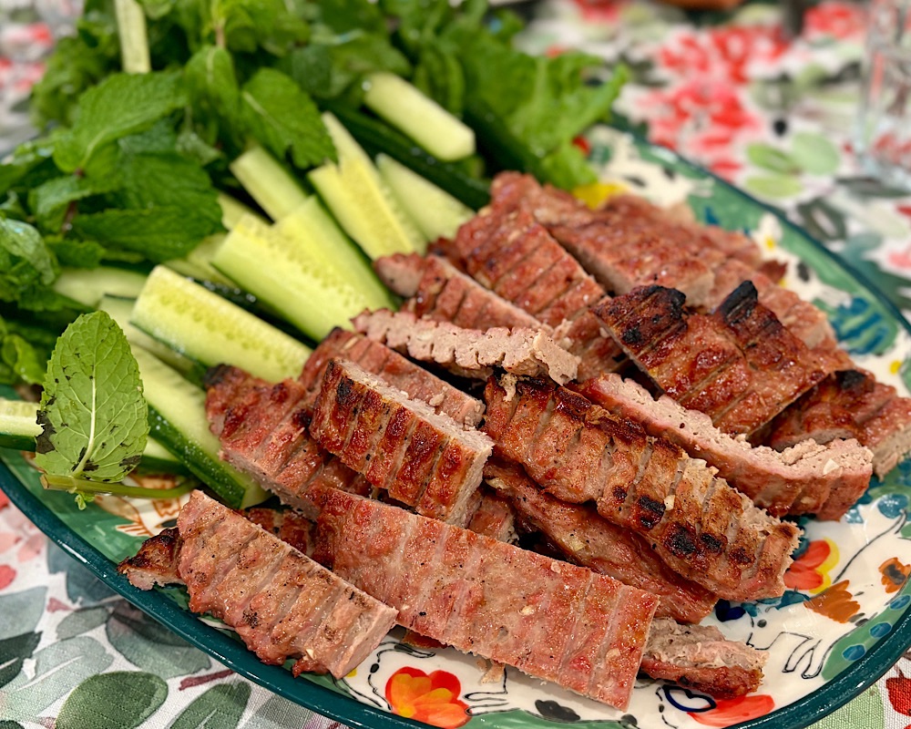Remove the grilled pork from the baskets and slice into strips. Serve immediately with lettuce, cucumber, and fresh herbs for wrapping.